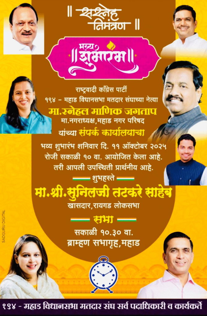 एकंदरीत, “घड्याळ तेच, जागा तीच – पण उद्घाटन नव्याने” अशा घोषणेसह राष्ट्रवादी काँग्रेस (अजित पवार गट) महाड नगरपरिषदेच्या निवडणुकीचा प्रचार येथे सुरू करणार आहे. या नवीन कार्यालयातूनच जिल्ह्याच्या राजकीय रणधुमाळीची बीजे रोवली जाण्याची शक्यता आता व्यक्त केली जात आहे.