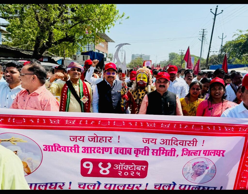 पालघर: “आरक्षण आमच्या हक्काचं, नाही कोणाच्या बापाचं! (Reservation is our Right not anyone’s Legacy)” — या घोषणांनी आज पालघर शहर दणाणून गेले. आदिवासी आरक्षण बचाव कृती समिती (Adivasi Reservation Bachao Kriti Samiti) च्या नेतृत्वाखाली काढण्यात आलेल्या ‘जन आक्रोश विशाल मोर्चा (Palghar Adivasi Reservation Protest Rally)’ मध्ये जिल्हाभरातील लाखो आदिवासी बांधव सहभागी झाले.